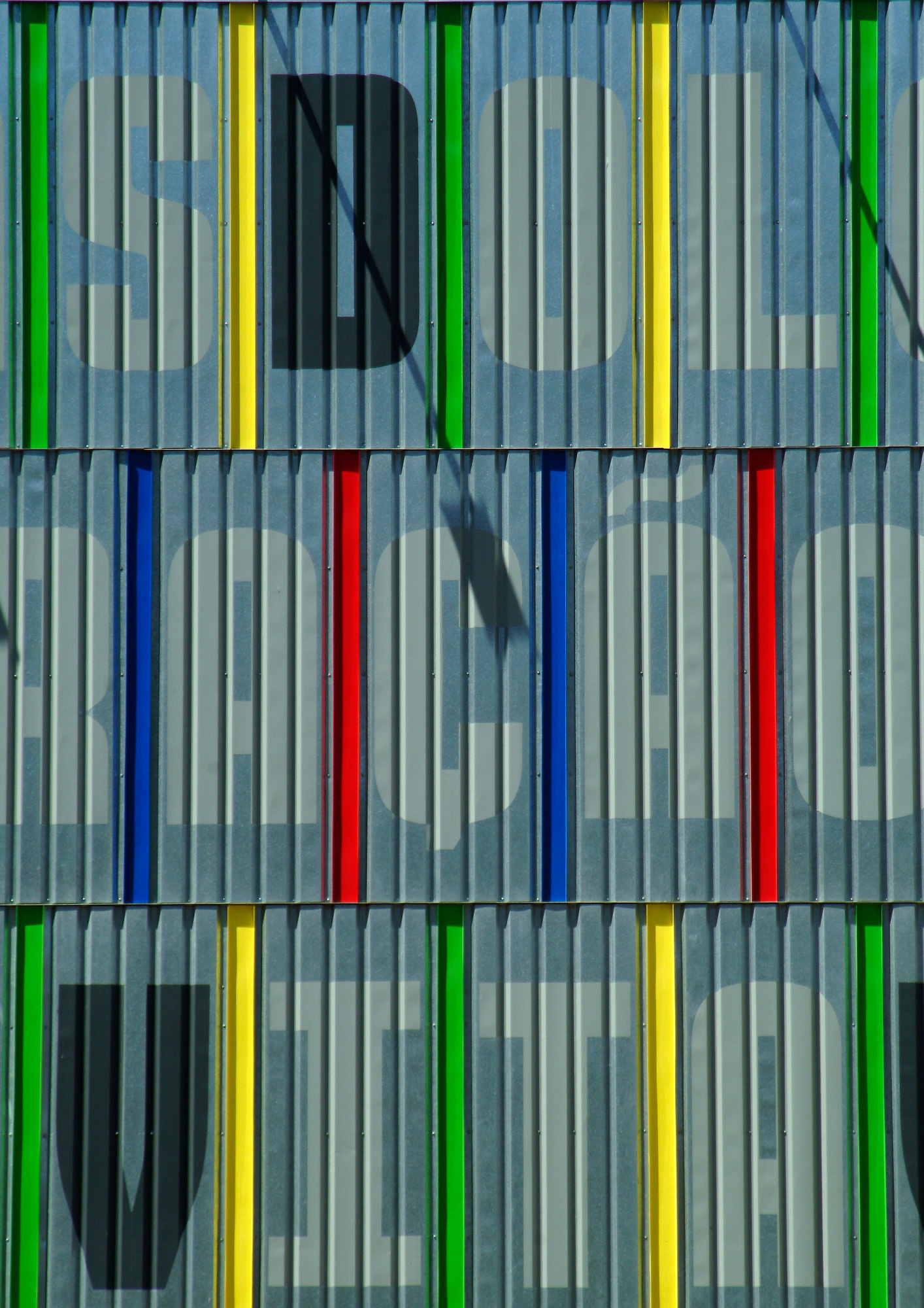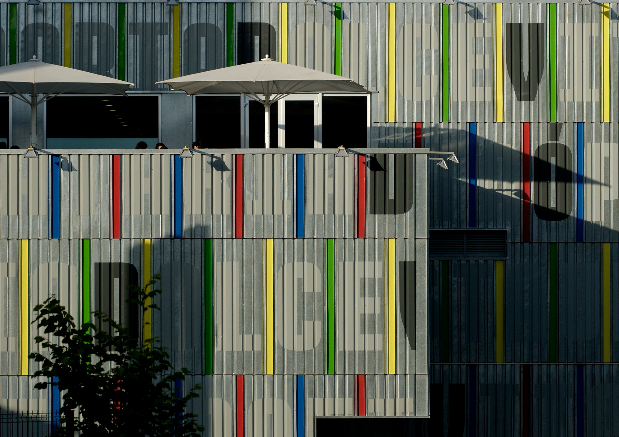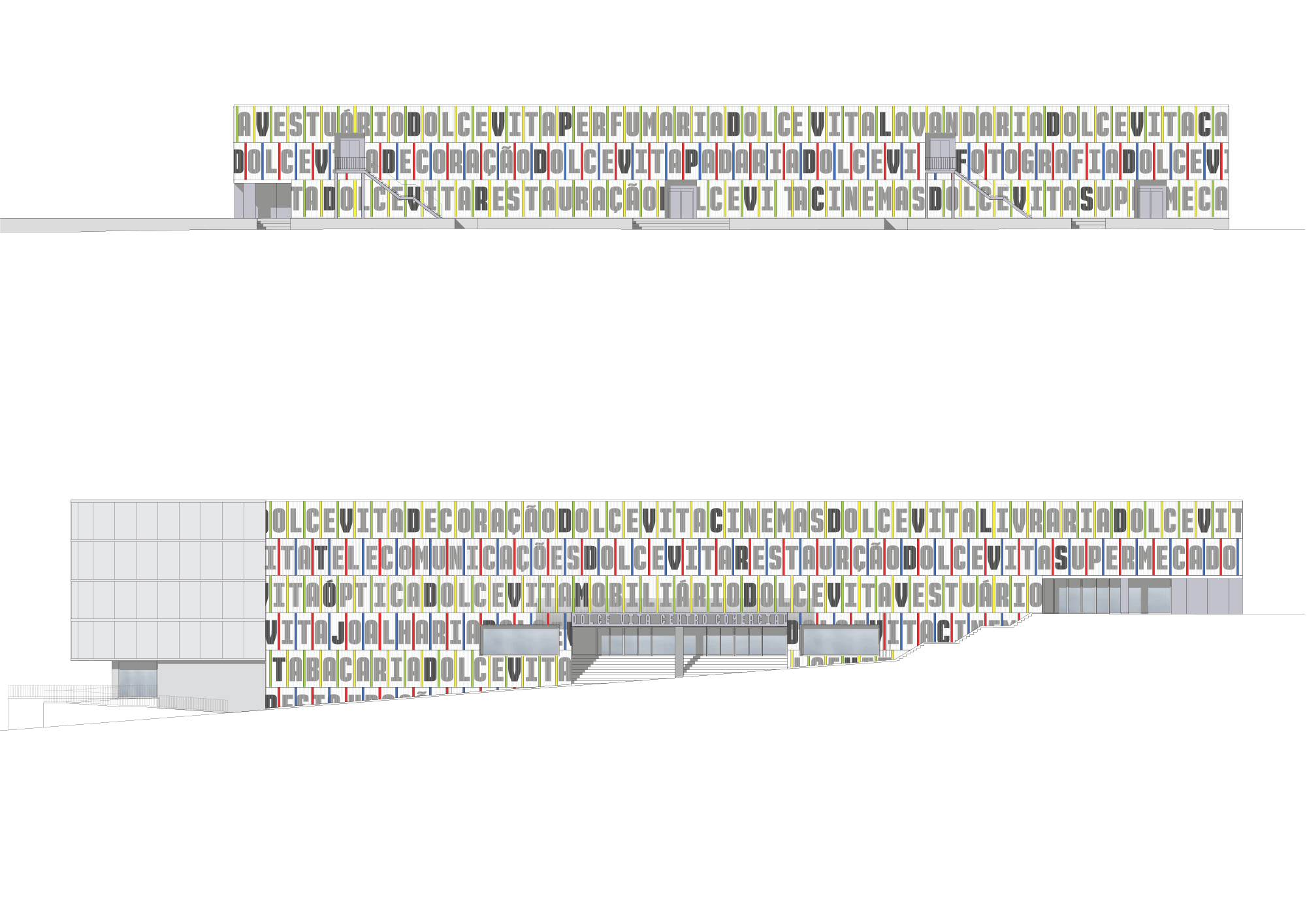 However, to be effective, this revamping should turn around the image of the building and attract better shop brands and more visitors. On the outside, the operation consisted in covering the existing stone façade with a new skin of galvanised metal sheets as a support for a graphic design informing the visitor on the mall’s commercial contents.
