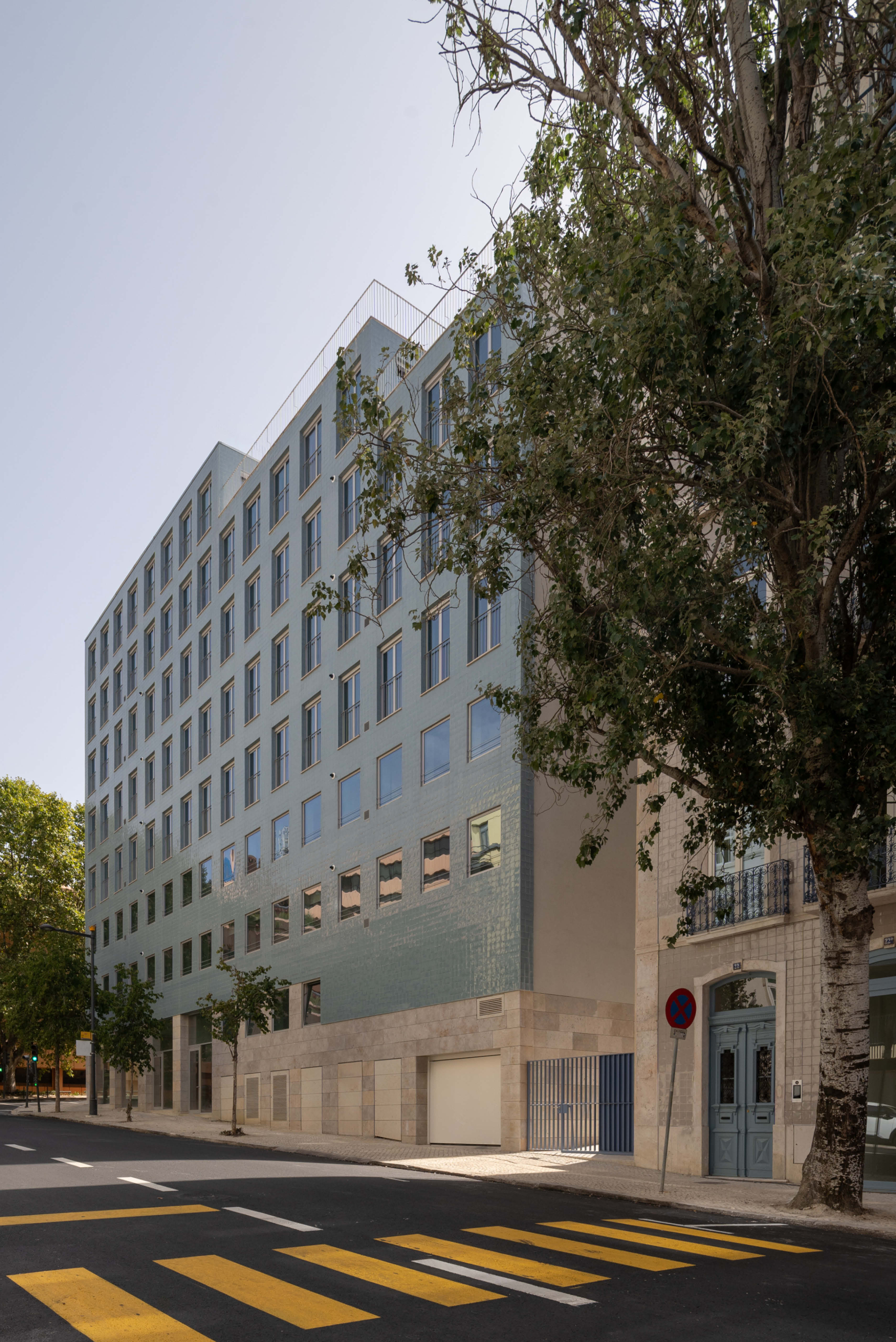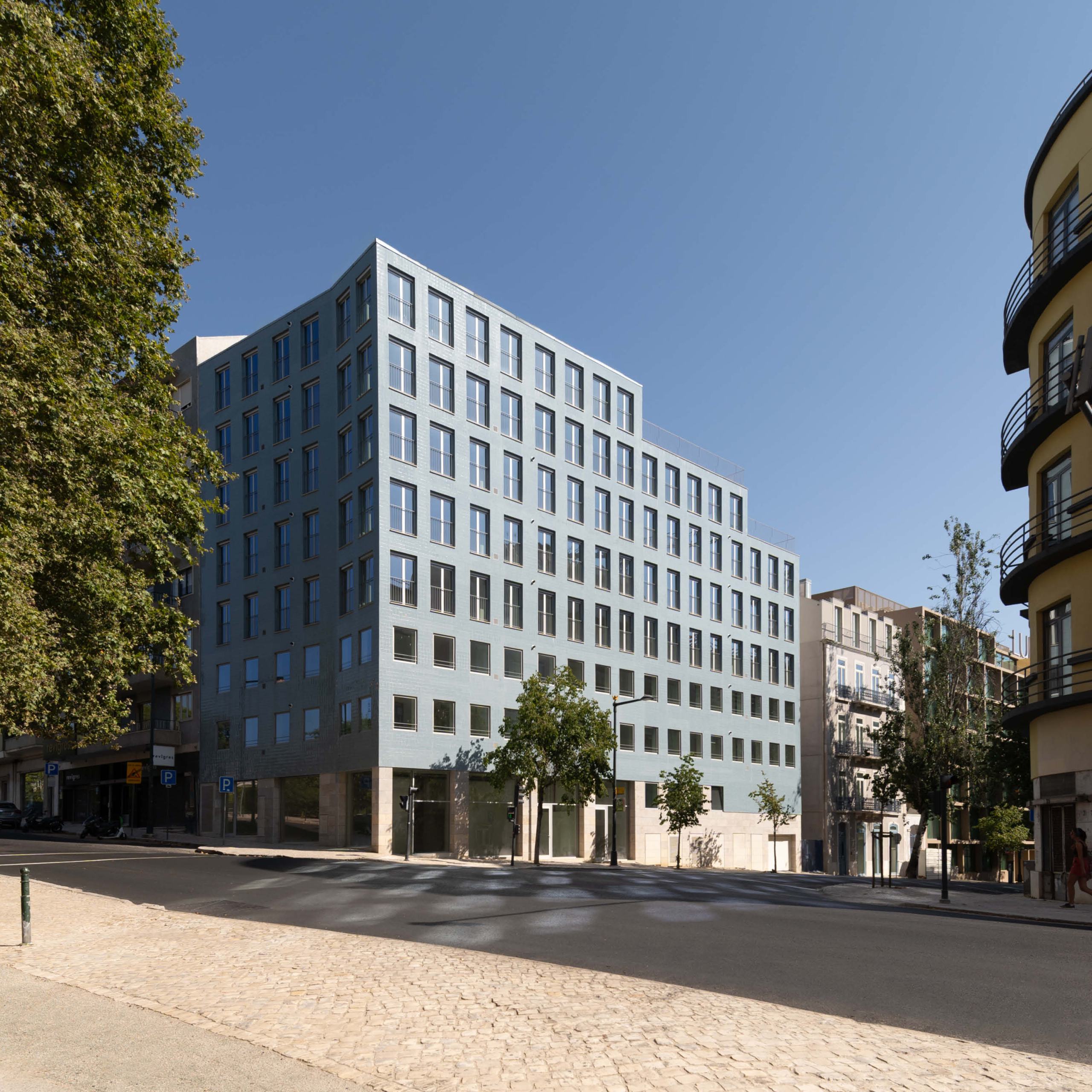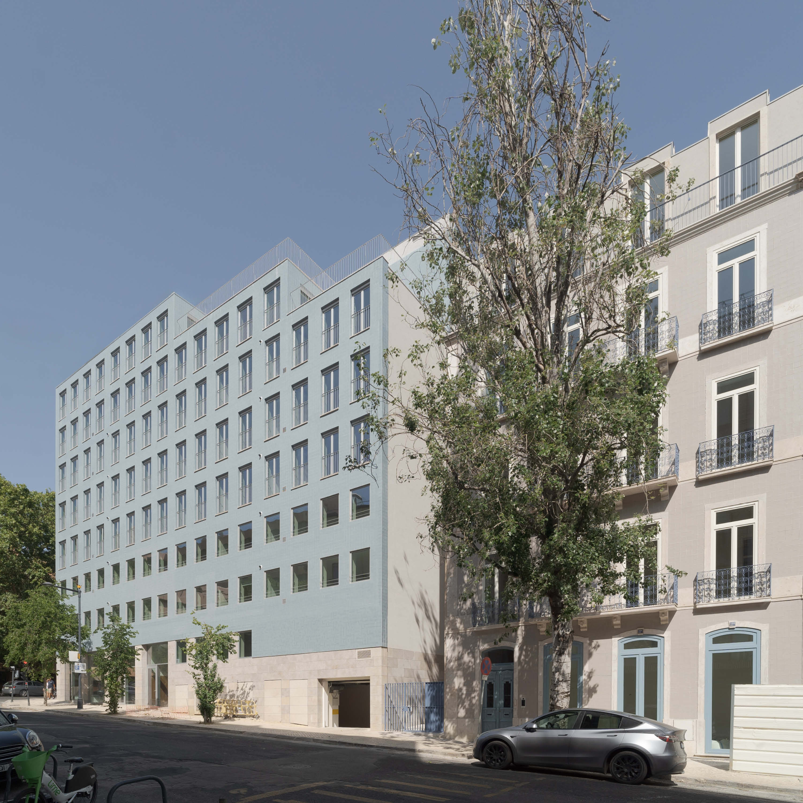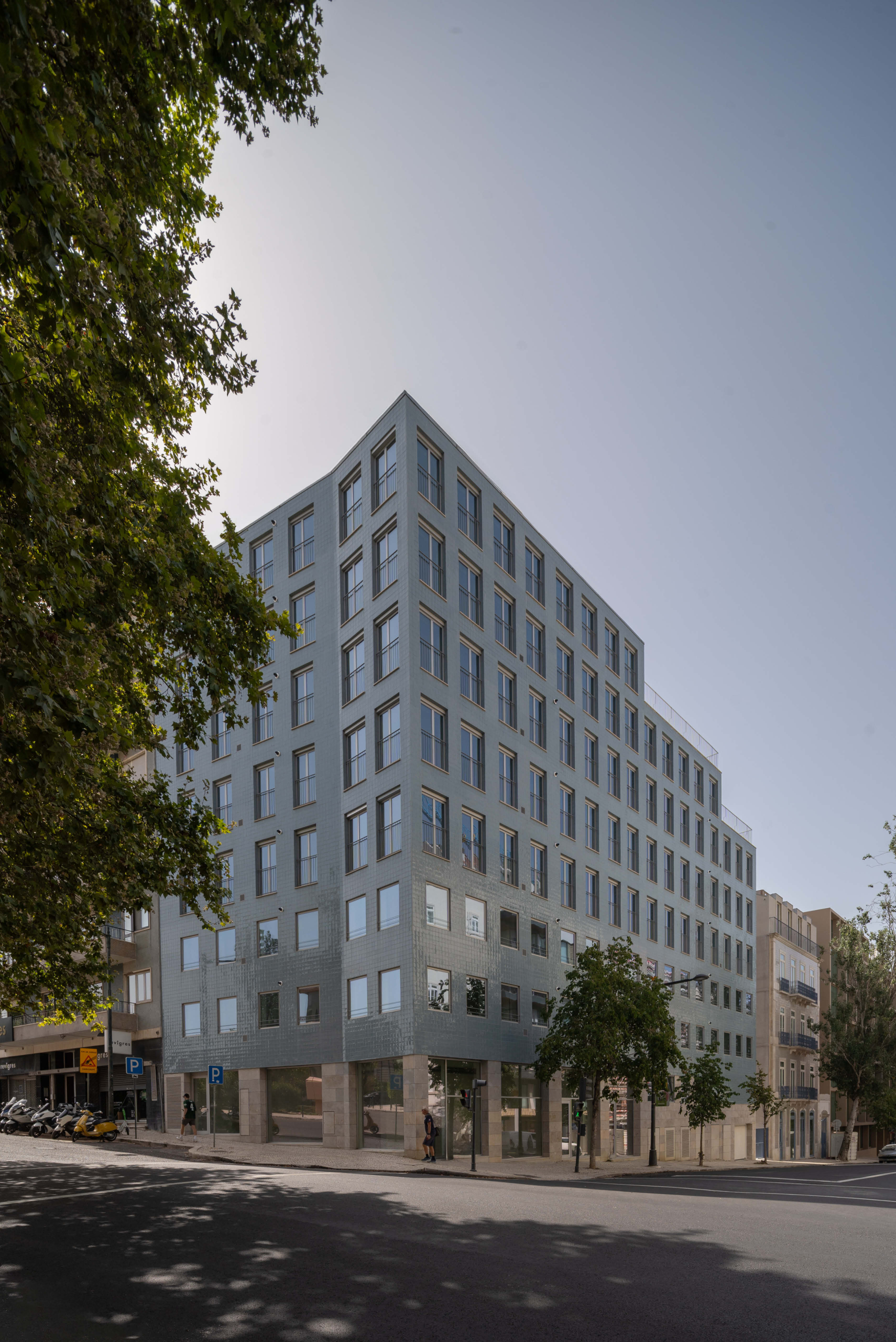 The 8-storey building is located in prominent corner with Tomás Ribeiro street and it consist in studios and 2-bedroom apartments purposely designed for the rental market, in addition street retail with parking and private storage in 3 basement levels. The simple geometry of the façade seeks both an alignment with the adjacent buildings as well as mediating the street incline by a stepped cornice, with a window composition that widens as floors rise. In terms of materiality, the design summons Lisbon’s traditional façade combination of a limestone plinth with handmade tiled upper storeys. The adjacent 3-storey building dating from the early 1900s is part of the property and will be renovated and increased in two floors with a mansard zinc roof.