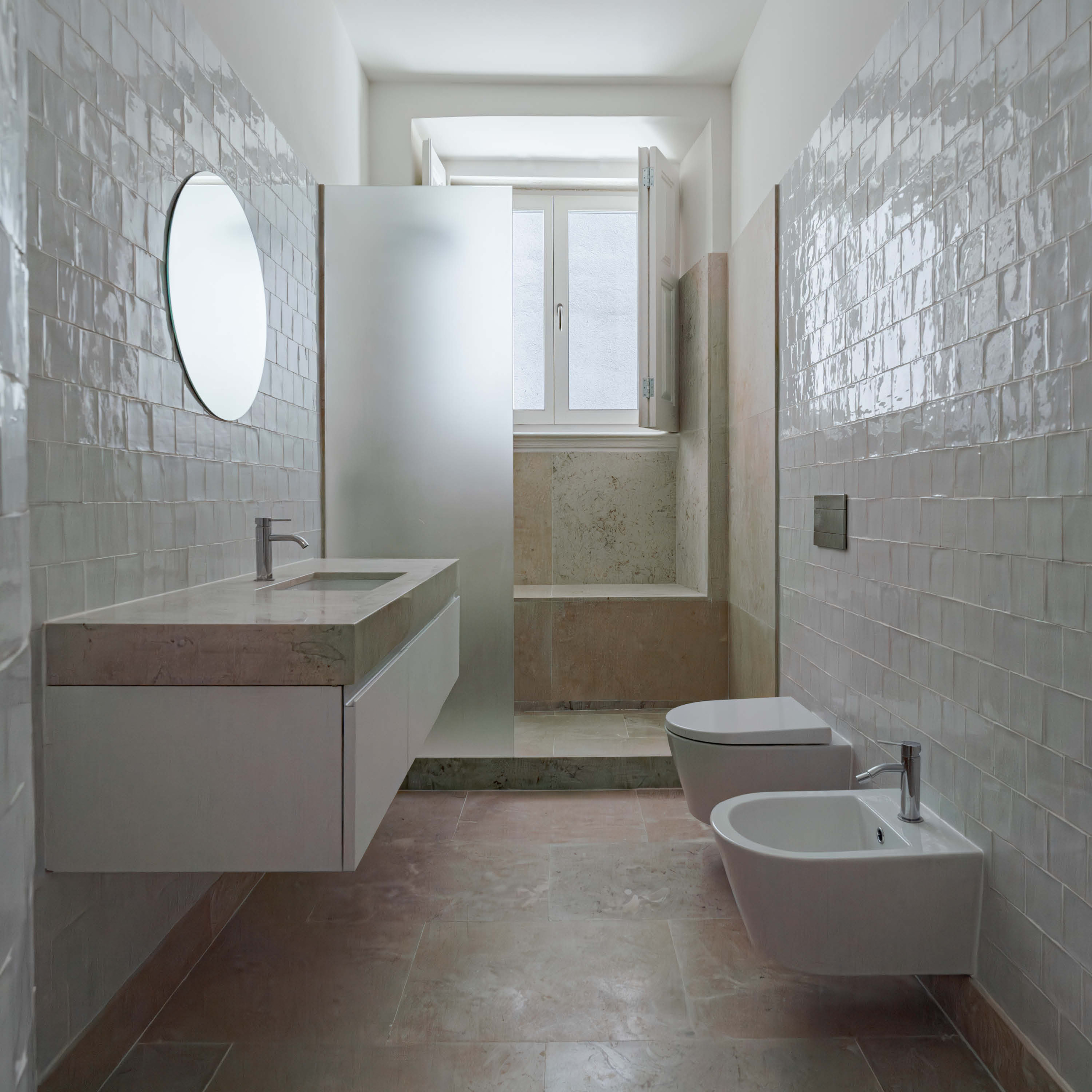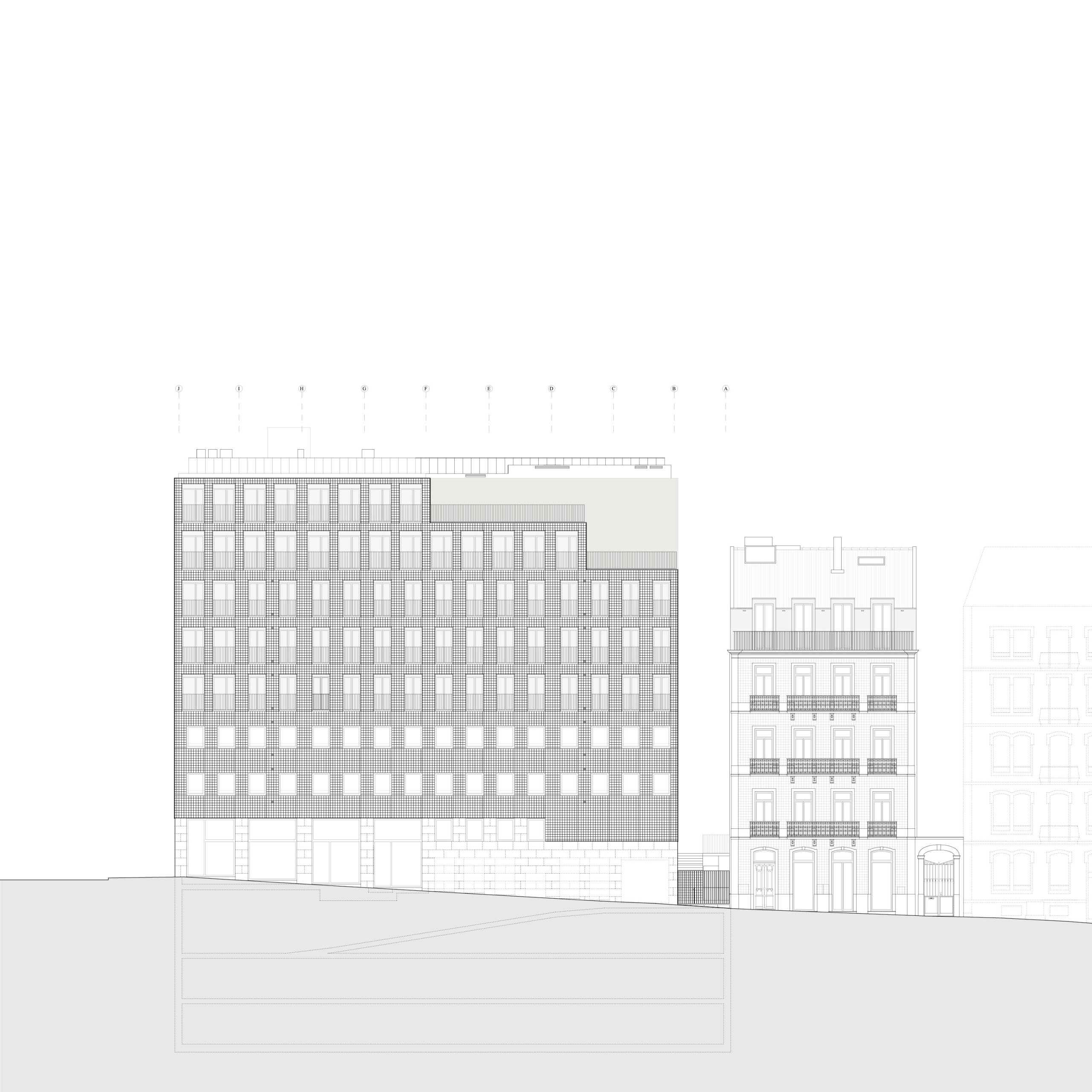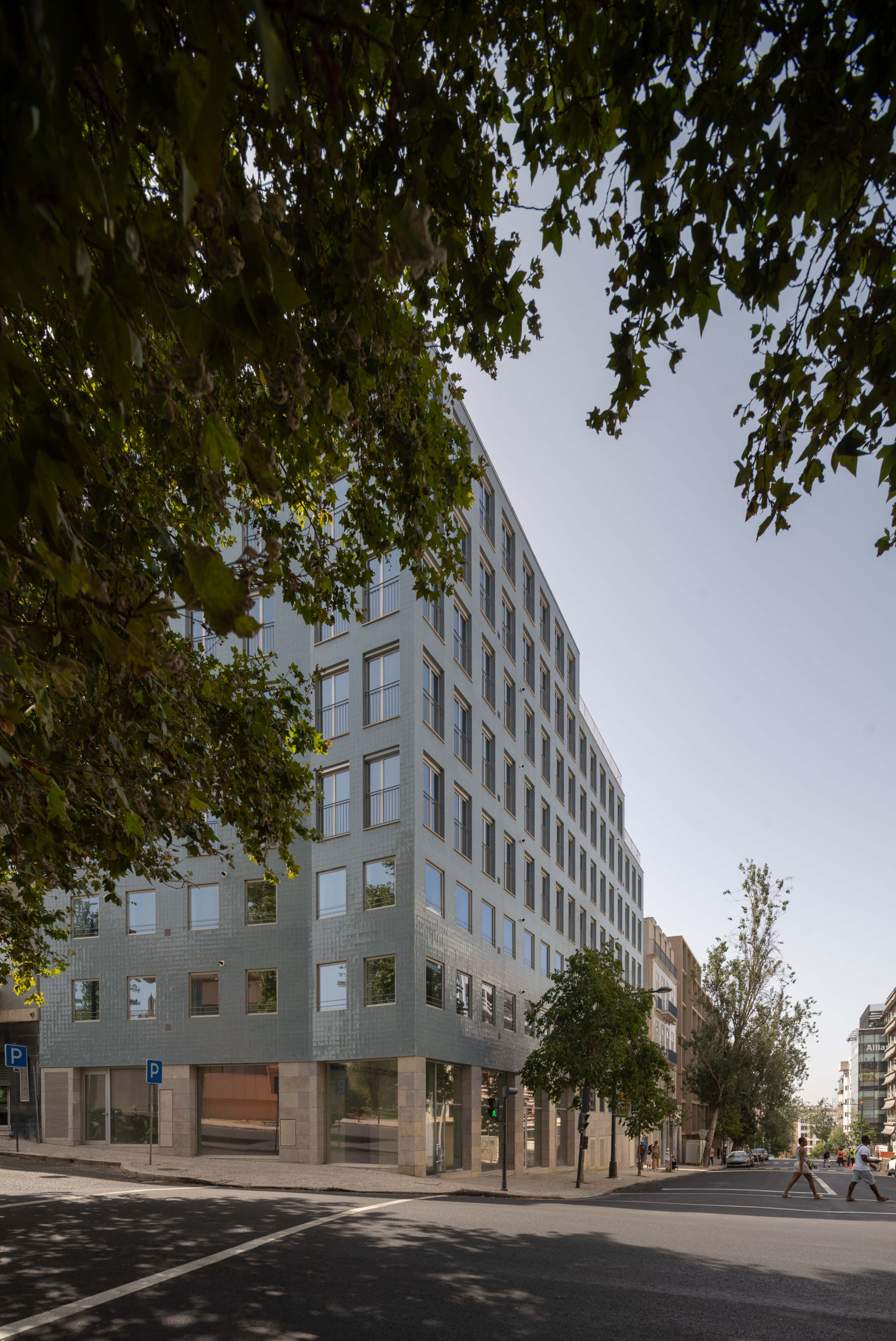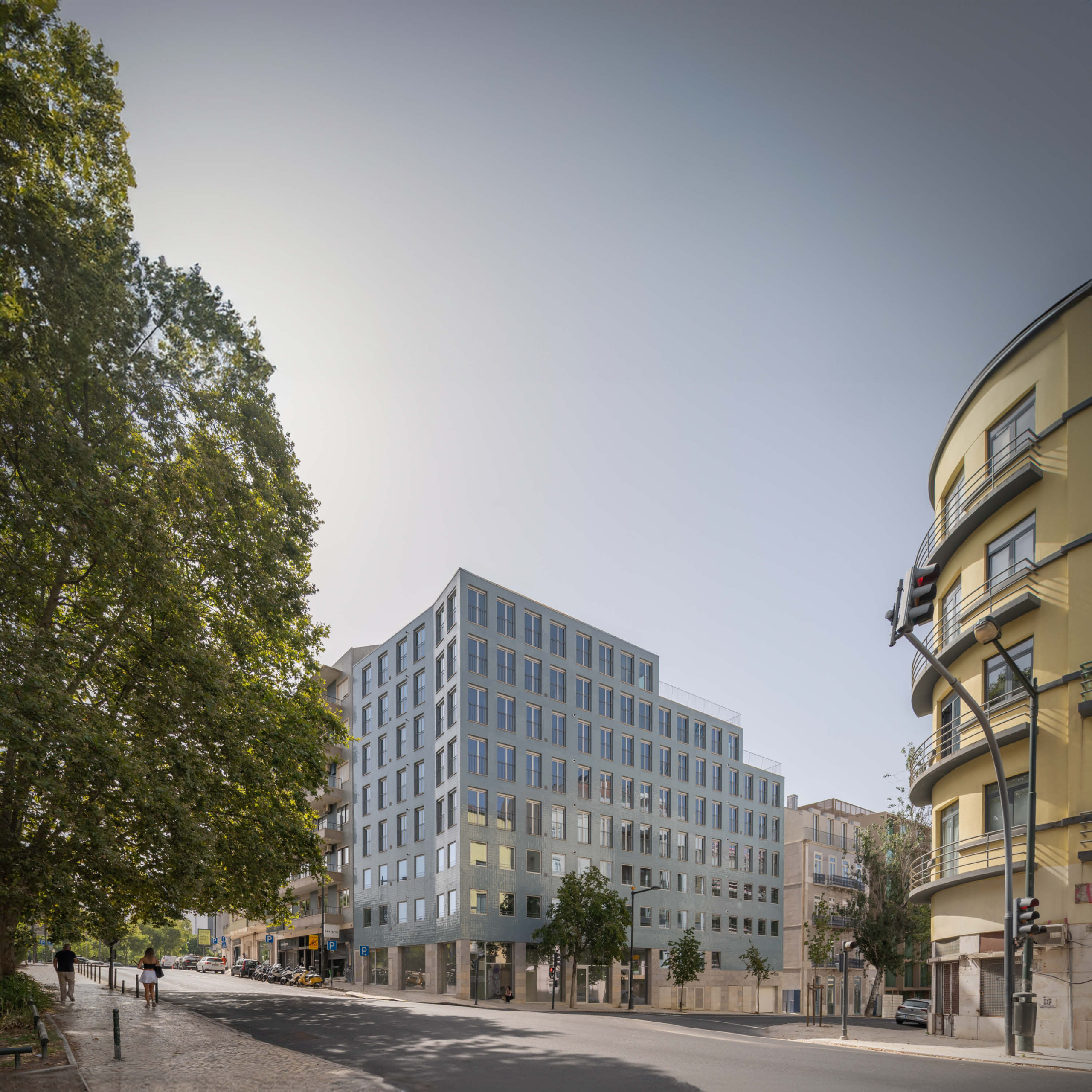 The 8-storey building is located in prominent corner with Tomás Ribeiro street and it consist in studios and 2-bedroom apartments purposely designed for the rental market, in addition street retail with parking and private storage in 3 basement levels. The simple geometry of the façade seeks both an alignment with the adjacent buildings as well as mediating the street incline by a stepped cornice, with a window composition that widens as floors rise. In terms of materiality, the design summons Lisbon’s traditional façade combination of a limestone plinth with handmade tiled upper storeys. The adjacent 3-storey building dating from the early 1900s is part of the property and will be renovated and increased in two floors with a mansard zinc roof.